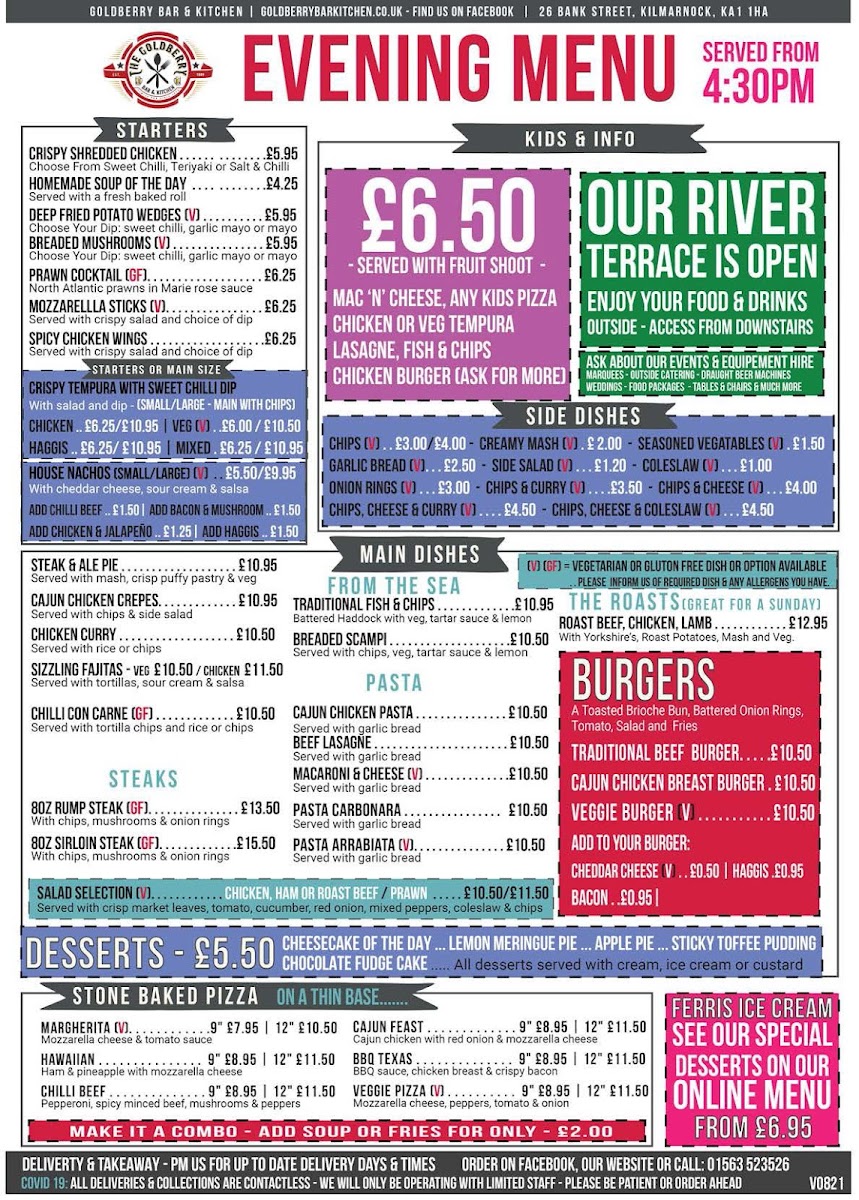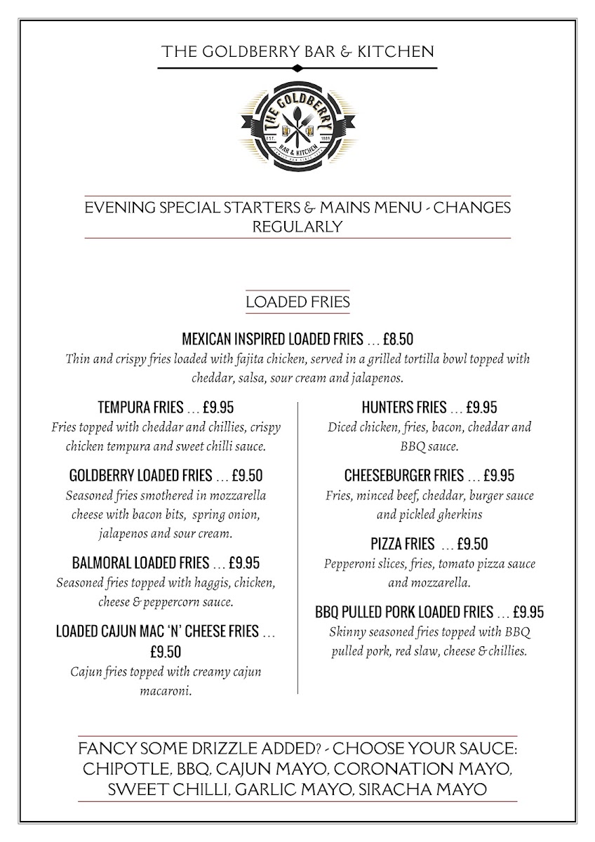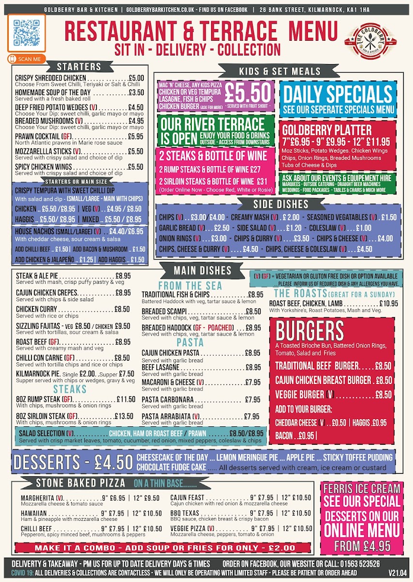 The menu at Goldberry Bar & Street Kitchen offers a delightful mix of hearty comfort foods and flavorful dishes. For starters, diners can enjoy options like Crispy Shredded Chicken, Homemade Soup Of The Day, and Prawn Cocktail, with some dishes available in both starter and main sizes, such as Crispy Tempura with Sweet Chilli Dip and House Nachos. The steak section is particularly tempting, featuring Cajun Chicken Crepes, Steak & Ale Pie, and the classic 8oz Rump Steak. Those craving something spicy can opt for Sizzling Fajitas. Pasta lovers will find comfort in dishes like Cajun Chicken Pasta, Beef Lasagne, and Macaroni & Cheese Pasta. Side options include Chips, Garlic Bread, and Creamy Mash, alongside a variety of salads and vegetables. For burger enthusiasts, there are options like the Traditional Beef Burger, Cajun Chicken Breast Burger, and a Veggie Burger. Stone-baked pizzas, including Margherita, Hawaiian, and Chilli Beef, cater to pizza lovers, while seafood options include the classic Traditional Fish & Chips and Breaded Scampi. The menu also boasts tempting specials like the Cajun Feast and the BBQ Texas, along with options for a romantic night out, including 2 Rump Steaks & Bottle Of Wine or 2 Sirloin Steaks & Bottle Of Wine. The menu at Goldberry offers a satisfying selection that caters to a variety of tastes, ensuring there's something for everyone to enjoy.